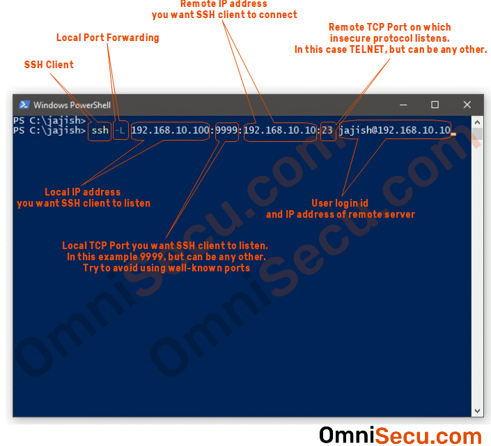 ssh -L 192.168.10.100:9999:192.168.10.10:23 jajish@192.168.10.10